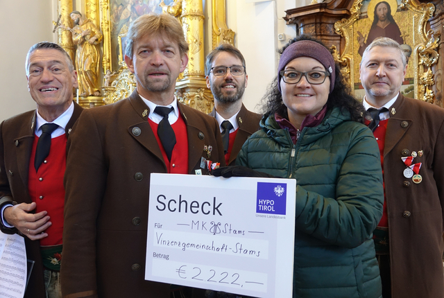 Nicht mit einem Zeltfest, sondern mit einem Benefizkonzert samt buntem Programm gaben sie dem Ganzen das Motto „Stamser für Stamser". Zum Höhepunkt des Jubiläumsjahres spendeten die Musikanten im Rahmen der Cäcilienmesse einen zur Jubelzahl passenden Betrag von 2.222 Euro an die Vinzenzgemeinschaft Stams.