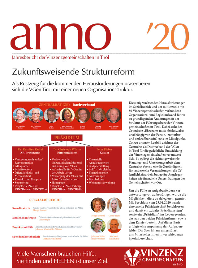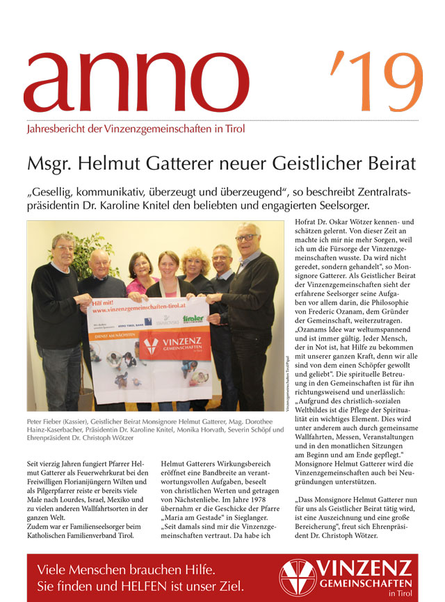 2. 9. 2020: Mit ihren 80 Gemeinschaften im ganzen Land verfügen die Vinzenzgemeinschaften Tirol über ein dichtes Netz der Hilfsbereitschaft. In ihrem Tun unterstützt sie künftig der erfahrene Theologe Msgr. Cons. Helmut Gatterer.