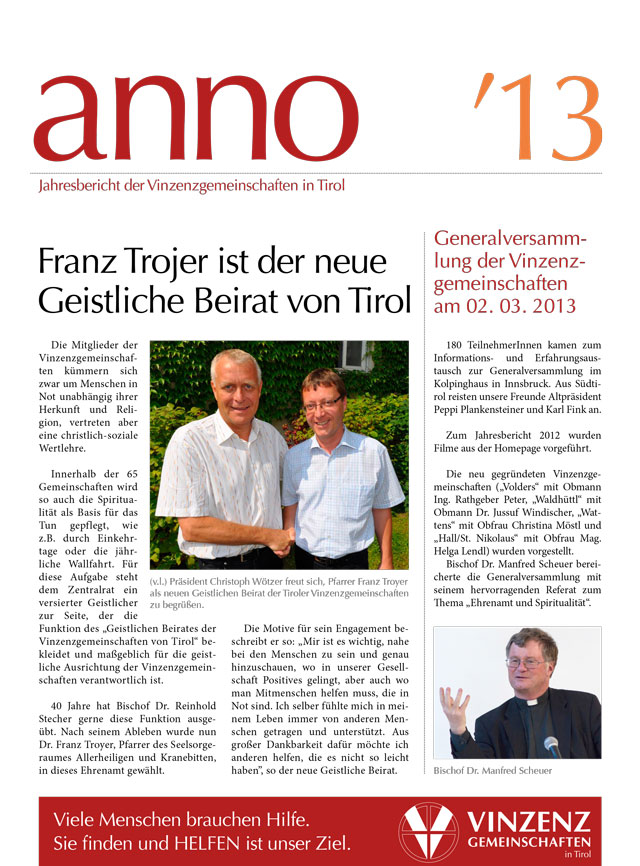 19. 7. 2013: Im Haus St. Josef am Inn stellten die Tiroler Vinzenzgemeinschaften ihren neuen geistlichen Beirat vor. Pfarrer Dr. Franz Troyer, Pfarrer von Allerheiligen, wurde in dieses Ehrenamt gewählt.