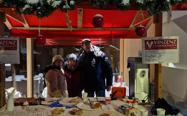 11. 12. 2022: Mehr als zwei Dutzend feine Torten und Kuchen, gebacken von PatscherInnen und verkauft von VinzentinerInnen, verwöhnte die vielen BesucherInnen am Patscher Adventmarkt.