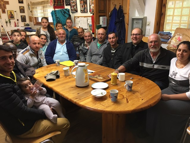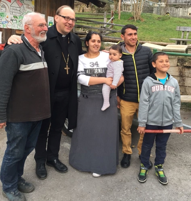 Wir spazierten durch die Gärten und Weideflächen, sprachen über Esel, Schafe, Enten und Landwirtschaft. Besonders interessierte den Bischof die Unterkunft für inzwischen doch 30 Leute, ArmutsmigrantInnen aus der Slowakei und Rumänien, auch die Geschichte des Widerstandes u.a.m. Es folgte ein Gespräch mit den Bewohnerinnen, der Bischof erzählte aus seinem Leben. Im Gebet spielte Bella mit der Geige zur Ehre Gottes, die Familien aus Valea Monastiri sangen, der Bischof sprach den Segen. Bischof Hermann schenkte uns eine wunderschöne rumänische Pantokratorikone. Schön , wenn einen der Bischof ganz spontan und ganz unkompliziert besucht, eine große Wertschätzung für die Leute, die es nicht so leicht haben.