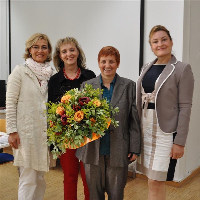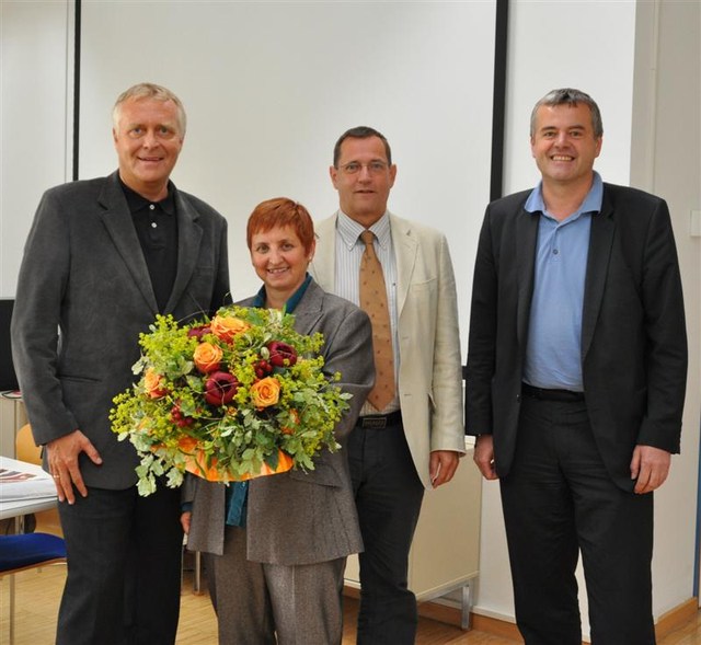 (v.li) Dr. Christoph Wötzer, Dir. Erwin Luchner und Dr. Hubert Innerebner (v.li.) bedankten sich bei Prof. Waltraud Ploner für Ihr Engagement im Rahmen des Jugend-Wettbewerbs.