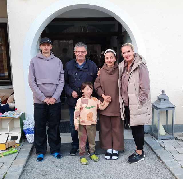 Im Bild: Eine Familie aus der Ukraine mit VG Axams Obmann Luis Pleifer und Christine Bucher, Besitzerin des CBM Hotels in Axams