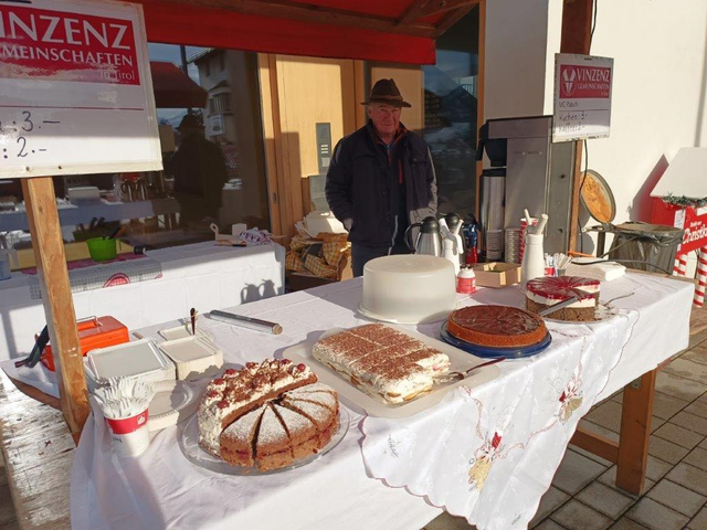 Allerlei feinste Torten und Kuchen und herrlich duftender Kaffee – all das erwartete die Leute am Adventmarkt in Patsch. Die wohlschmeckenden süßen Köstlichkeiten entstanden in den Küchen der fleißigen Patscher Hausfrauen, die diese den Vinzenzgemeinschaften kostenlos zur Verfügung stellten. Der Erlös aus dem Verkauf bekommt die VG Patsch, um Gutes zu tun. Dafür ein herzliches Dankeschön!