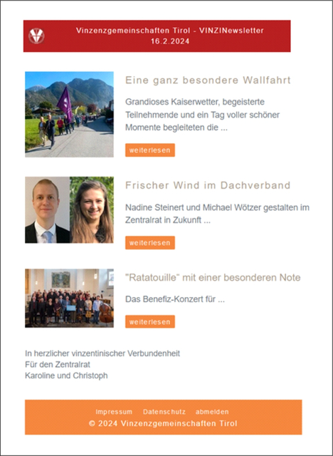 Um die breite Öffentlichkeit auf dem Laufenden zu halten, bieten die Vinzenzgemeinschaften den Social Media Kanal Instagram und ebenso wird die Homepage oft und gerne besucht. Unsere Homepage www.vinzenzgemeinschaften-tirol.at wird mit ihrem Downloadbereich „Service-Herunterladen" auch von Sozialeinrichtungen gerne genutzt und verzeichnete 2023 über 28 000 Seitenaufrufe.