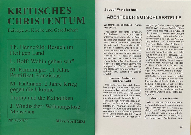 Wir möchten den beachtenswerten Artikel, den er für die Zeitschrift "Kritisches Christentum " zum Thema "Notschlafstelle" geschrieben hat, mit euch teilen.
