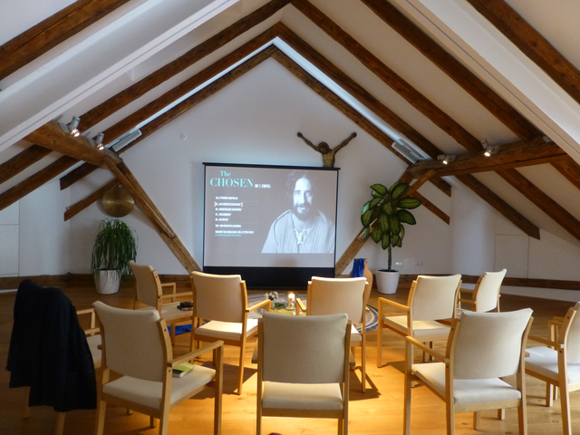 Da Petrus heuer nicht gnädig war und keinen meditativen Spaziergang im wunderbaren Garten zuließ, wurde der Seminarraum nach dem Mittagessen kurzerhand zum Kinosaal adaptiert und eine Folge aus der Serie "The Chosen" gezeigt. "Ein besonderes Geschenk" greift das Wunder der Hochzeit zu Kana auf und zeigt Jesus durch die Augen derer, die ihm begegnet sind, als menschlich und göttlich zugleich. Ein Friedensgebet in der Kapelle schloss den sehr gelungenen Tag ab.